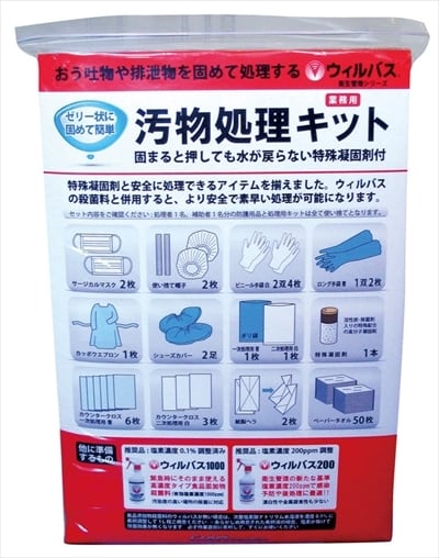 汚物処理に必要な防護用品から凝固剤、ペーパータオルまで13種類をキットに入れました!